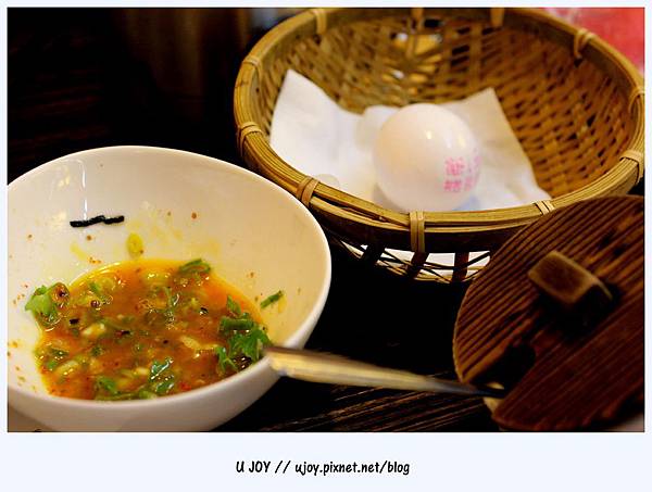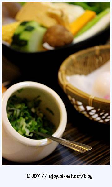 每一桌也會附上一小盅的蔥花,將蛋黃和蔥花加在沾醬裡一起食用,真的為各種食材增添了很多姿色!!