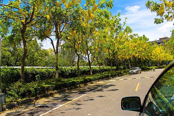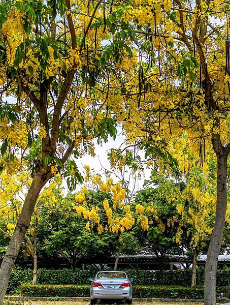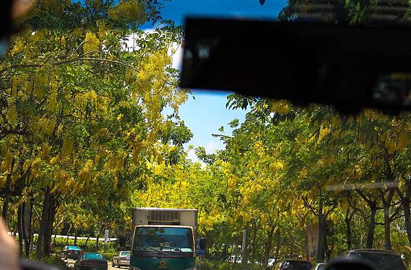 久到整台車都被阿勃勒給覆蓋成金黃的顏色,