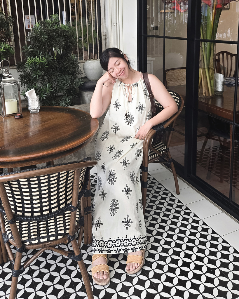 材質輕盈透氣,在清邁的濕熱天氣下完全扛得住,不黏膚、不悶熱,穿一整天也很舒服。我身高165公分,這件洋裝竟然可以穿到腳踝