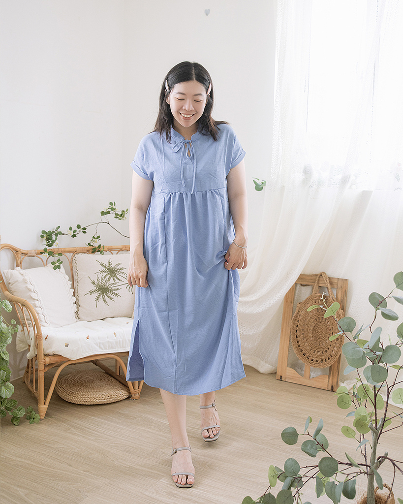 ▶ 10800449 純色透涼肌理感寬鬆綁帶洋裝單寧藍L 剛剛好舒適