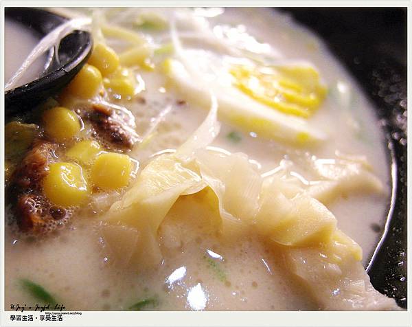 口感而這碗拉麵也有少量的蔥花點綴著它的外貌,玉米粒夾在在交織著的麵條中,