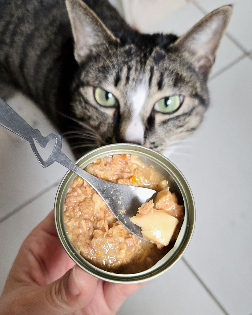 ✔ 湯汁自然,加入水也不會被討厭: 我平常有「偷偷幫他補水」的習慣,這款罐罐我試著在裡面加水,結果鱻森照吃不誤,喝水量直接 double,非常適合平常不太愛喝水的貓!