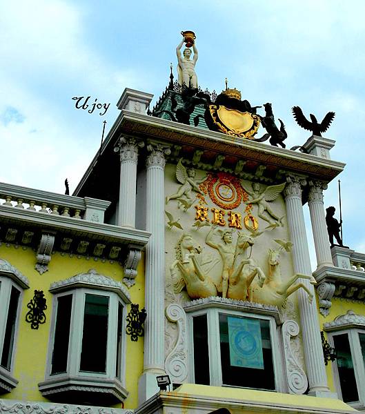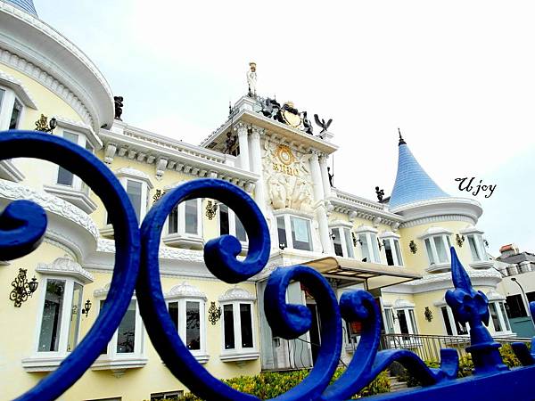 精緻的雕花纏繞著屋簷,藍屋頂黃壁面撐起整個視覺,