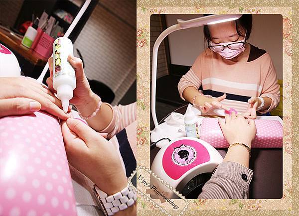 花花首先會幫妳上固定劑和底膠,作凝膠指甲的步驟基本上就是上一層膠就照光一次