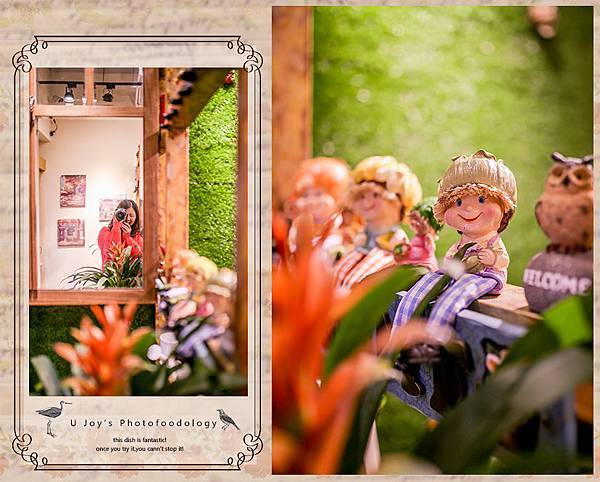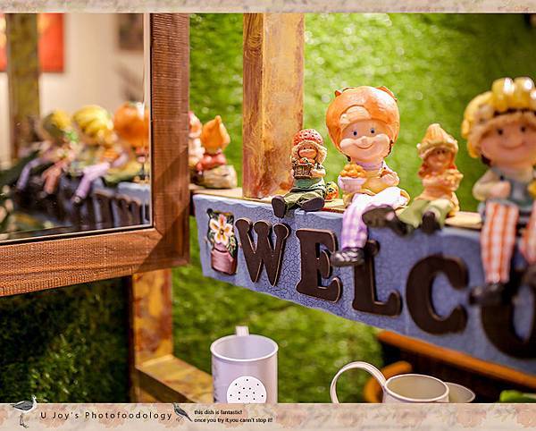 可愛的小人偶們在架上一字排開,背後印著栩栩如生的綠意