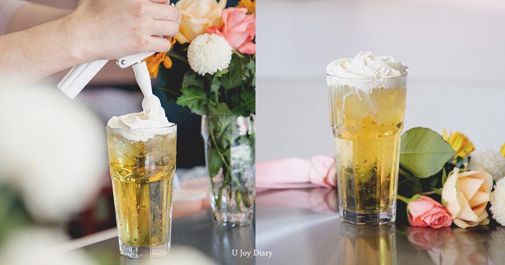 這款茶湯使用加入葡萄進行烘焙 ( 這就特別了吧! ) 的台灣文山包種茶製作而成,看到上面這麼厚的奶油是不是心頭一緊覺得有點姆湯? 但我真的要說,喝 起 來 好 清 爽 ! 這個氮氣奶霜真的可以很好的和茶湯融合,口感完全不油膩,還能讓茶更順口和帶有額外奶香,真的很讚。