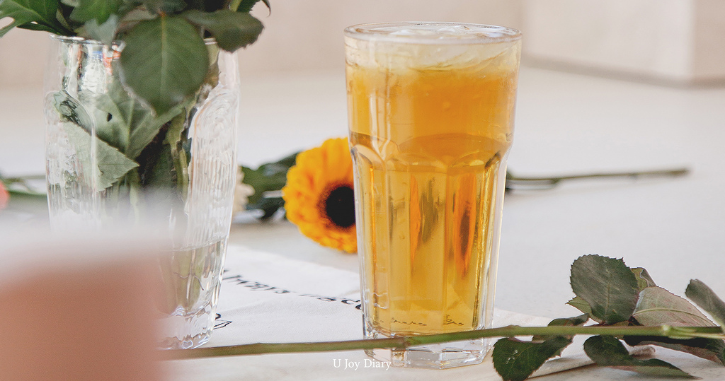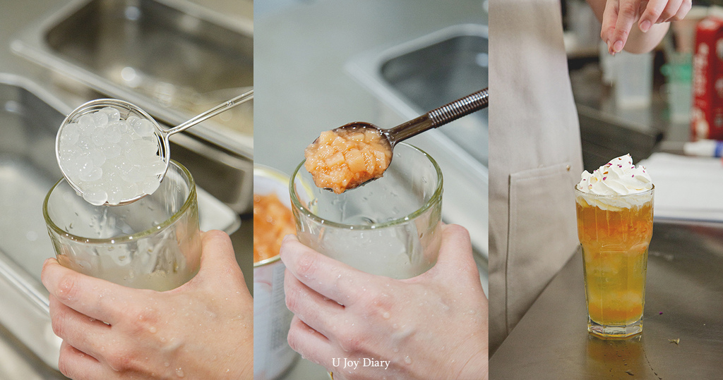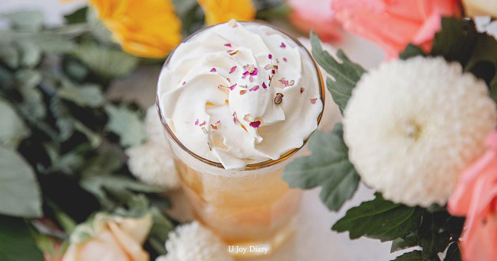 我最愛的一款當然要放壓軸! 茶湯使用透過三道窨花技術薰製,將玉蘭花和茉莉花花香透入輕度發酵的翠玉青茶。帶著花香的青茶! 真香呀! 另外加入份量絲毫不小氣的白桃丁和晶球,並灑上乾燥玫瑰花,一口吸入嘴裡有著玫瑰、蜜桃、奶香和茶香,酸甜酸甜,有水果的軟嫩又有晶球的Q彈,真的是超級豐富!