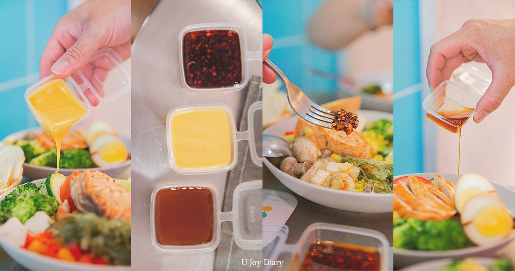 主食種類眾多,地上跑的海裡游的通通都有,像是阿根廷進口魷魚 、舒肥紹興雞腿排都很有看頭,肉品皆使用台灣本土肉品和美國上等牛以及急凍海鮮,層層把關溯源及產地,安全的部分有所講究。 豆雞眼溫沙拉也深知大家想要減少攝取澱粉的需求,主食的部分也有多種選擇,你可以選擇正常版餐盒、菜量加大的無飯餐盒,或是加點墨西哥烤餅! 如果你跟我一樣是肉食恐龍的話還可以加價加大肉量,各種需求都能夠被滿足👍️ 豆雞眼溫沙拉的美味秘訣就是高達11種的美味醬料,經典的胡麻醬、起司凱薩和和風芥末當然榜上有名,獨特的信義梅香和風醬、橙汁檸香醬等也是非常值得一試! 若你想要要無醬的話當然也是沒有問題! 醬料都是直接淋進去,若要另外用盒子裝要加購一塊錢盒子的費用呦