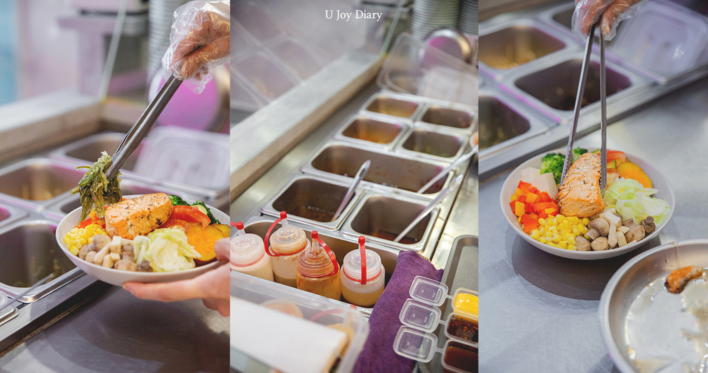 吧檯後可以看到各式小菜和醬料在等著你的挑選,餐盒的料理和組裝都清楚的在這裡上演。