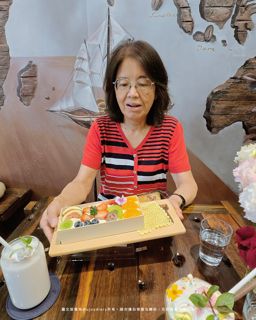 弁當盒裡滿滿鋪上無花果、葡萄、奇異果、橘子、藍莓、草莓,並使用香緹鮮奶油+茶香鮮奶油,不只新鮮度爆表,搭配的奶油非常清爽,連平常對甜食比較敏感的長輩也吃得很開心,完全沒有膩感! 而且戚風蛋糕非常濕潤,非常適合長輩的牙口
