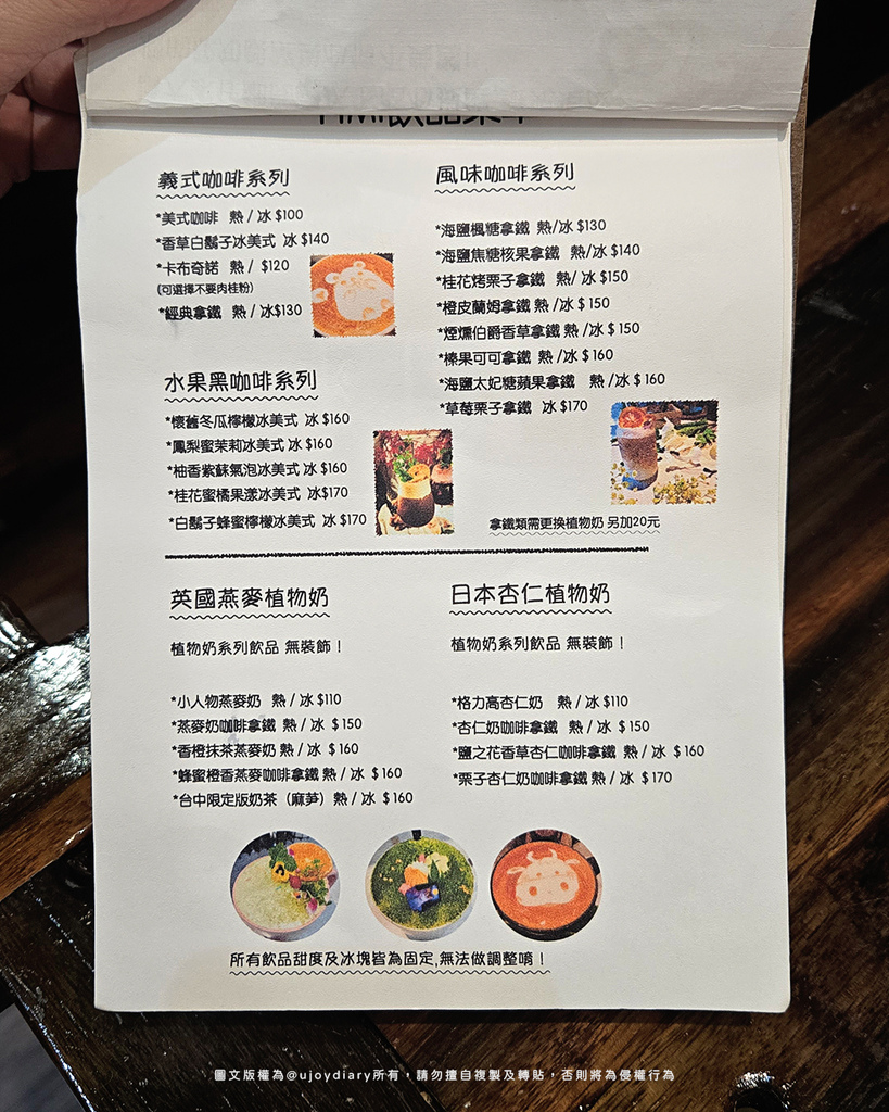 └ FiMi後山小廚房菜單中的咖啡與植物奶飲品選項,包含義式咖啡、風味咖啡、英國燕麥奶、日本杏仁奶等系列,價格約在110~170元間