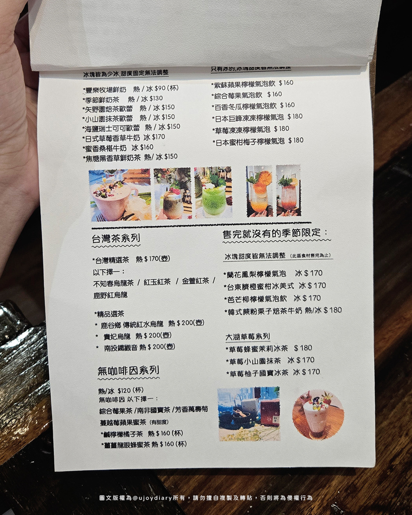 └ FiMi後山小廚房飲料包括無咖啡因系列、台灣茶、季節限定飲品與多款莓果系果茶,搭配繽紛圖片呈現很好讀!