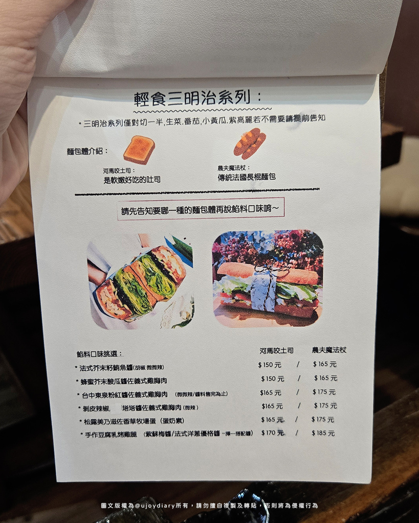 └ Fimi也有鹹點! FiMi後山小廚房提供多款三明治輕食,麵包可選厚切吐司或農夫法式麵包,口味包含香草嫩雞、紅藜蔬菜、德式香腸等