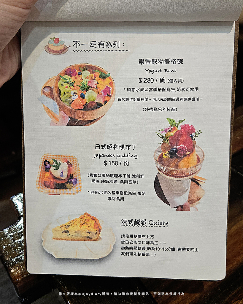 └ FiMi後山小廚房甜點菜單包括果香穀物優格碗、日式昭和硬布丁與法式鹹派等,擺盤精緻適合拍照打卡 :)