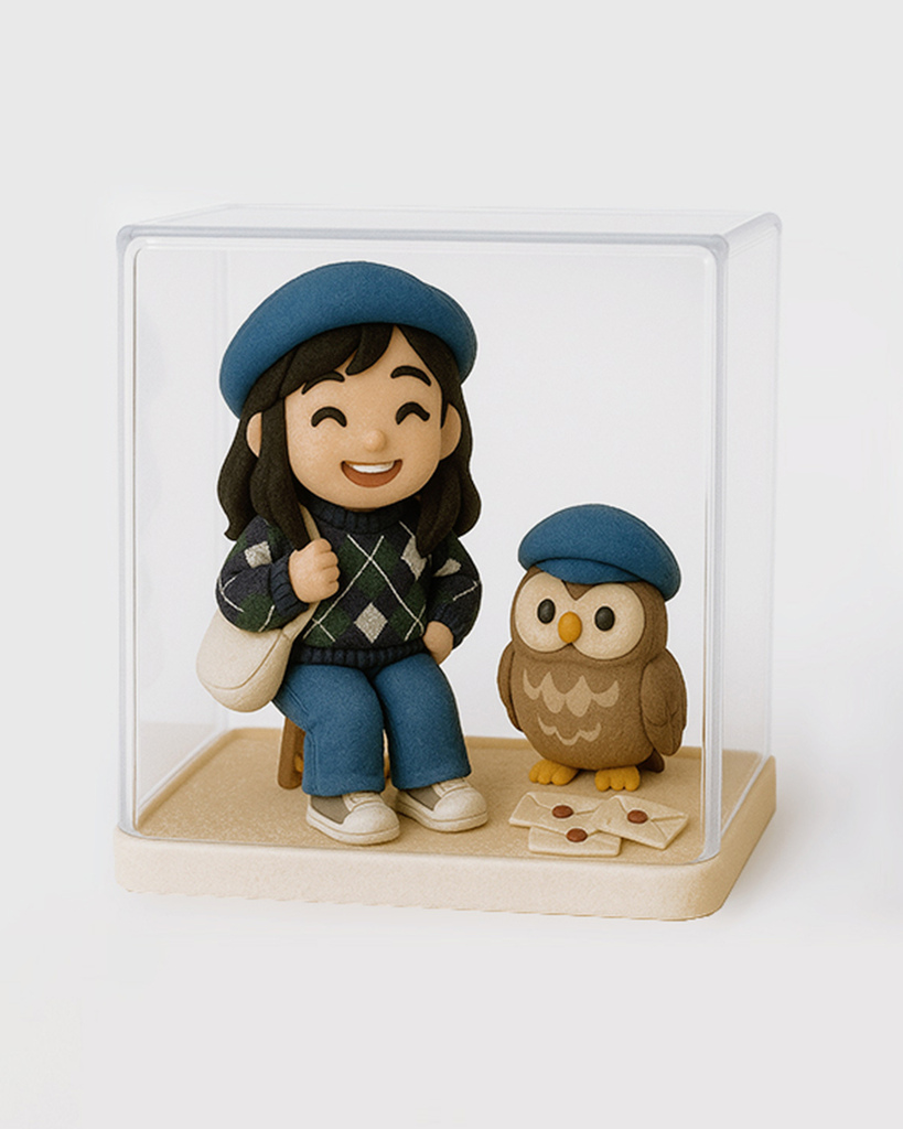上面這張照片我就給自己設計了個貓頭鷹夥伴 。·* 並為了讓小夥伴跟我有好情誼的感覺,還特別請GPT幫我們做了同款穿搭🤣 地上的,應該是它來不及送完的來自霍格華茲的信吧!