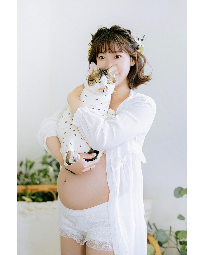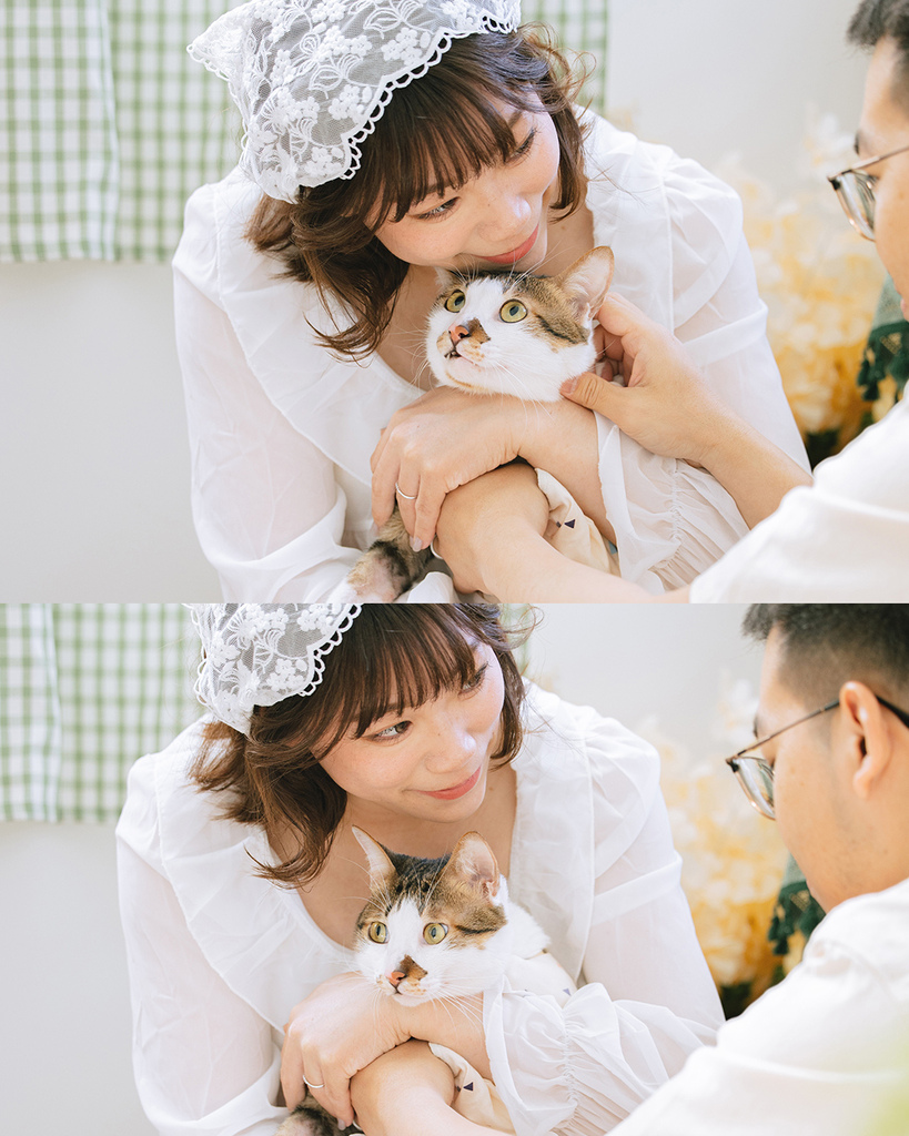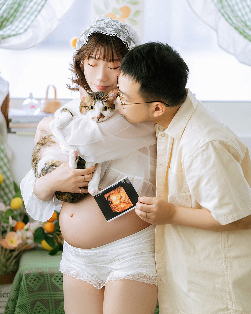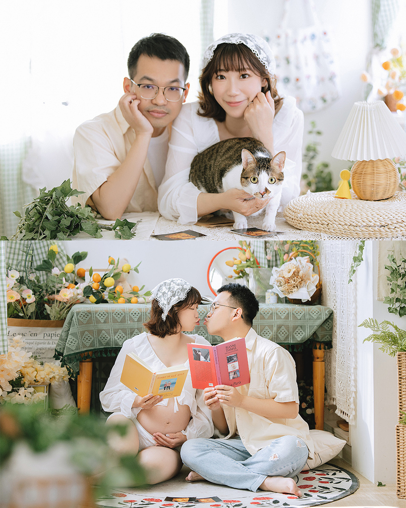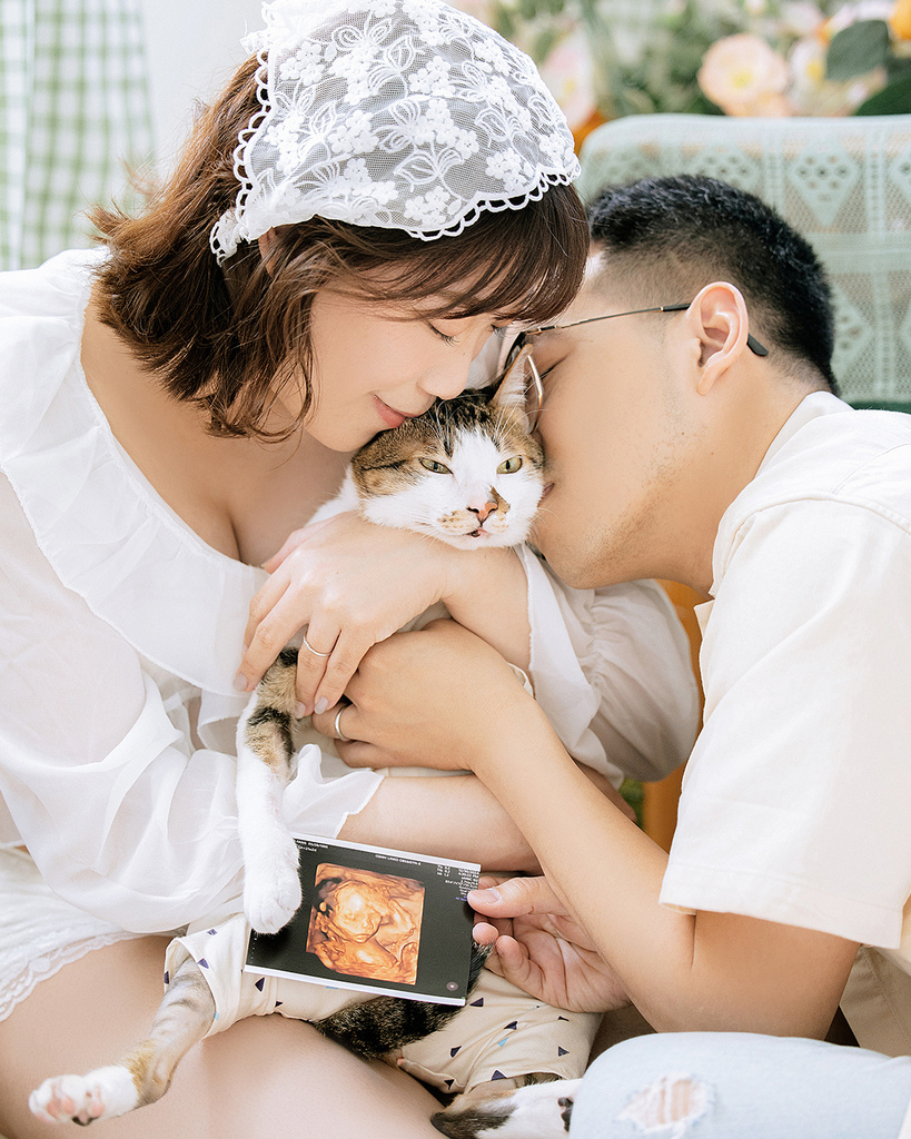 在拍攝之前,孕媽咪可芳就先跟我告知和溝通,他們在貓咖啡廳領養的濛濛是個敏感纖細的孩子(甚至是過度舔毛到需要穿防舔衣),所以我建議他們帶濛濛來好毛寵物攝影棚,可以讓孕媽媽拍攝得更輕鬆舒適,也能讓濛濛更好適應! 而兩人也爽快答應這個提案,這就是小時候都是同學的好處,就是大家的家都住好近~ 他們可以以最短車程的方式帶濛濛去回,也讓他們能夠更安心的拍攝!