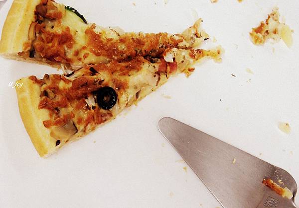 點pizza時,店家先讓我們選擇兩種口味,然後幫我們拼成一大片送上:))